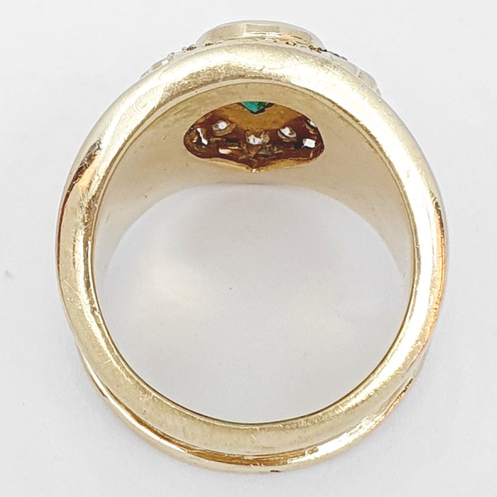 18 kt geelgouden ring met peer geslepen smaragd van 10,5 x 7,00 mm en een gewicht van 1,80 ct, omgeven door 18 briljant geslepen diamanten van ca. 2,0 mm en een gewicht van 0,031 ct per stuk, met een totaal gewicht van 0,558 ct.