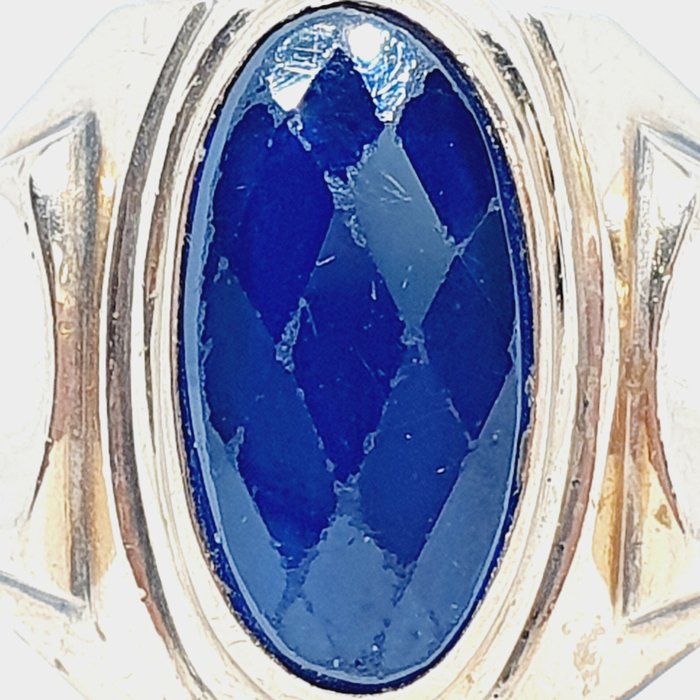 Zegelring met bewerkte synthetische saffier van 7,5 x 15 mm.