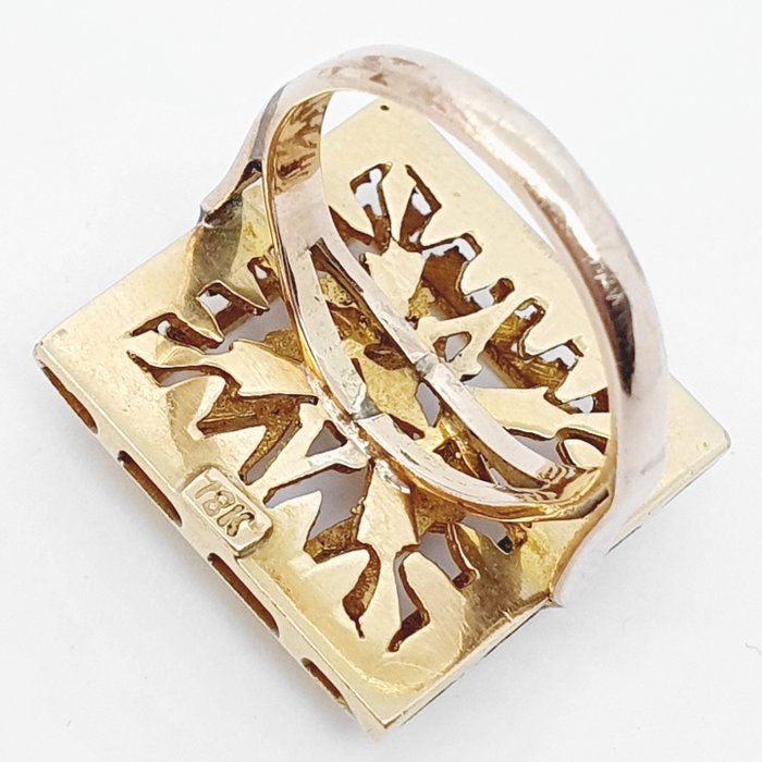 Ring met pre-Columbiaanse motieven in 18k geel goud, maar de arm (ongeveer 2,5 g) is 16k.