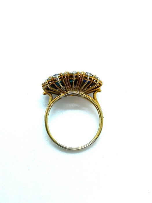 Het draagt drie diepblauwe ovaal geslepen saffieren, met een gewicht van ct. 0,50 per stuk en 20 natuurlijke briljant geslepen diamanten, ct. 0,02 elk.