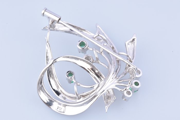 Broche van 18 kt witgoud, versierd met diamanten en smaragden.