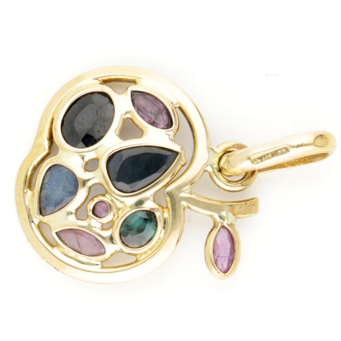 Geelgouden hanger, de hanger heeft een Italiaans design en is bezet met gefacetteerde synthetische robijn van ca. 0.06 ct. en gefacetteerde saffier van ca. 0.32 ct. De edelstenen zijn gezet in open kastzettingen. De hanger is vormgegeven als een appel.