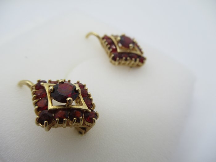 Het zijn twee ruitjes met in het midden een ronde granaat van 0.60 karaat en aan de zijkanten 14 granaten van in totaal 0.40 karaat (dit per oorbel)
