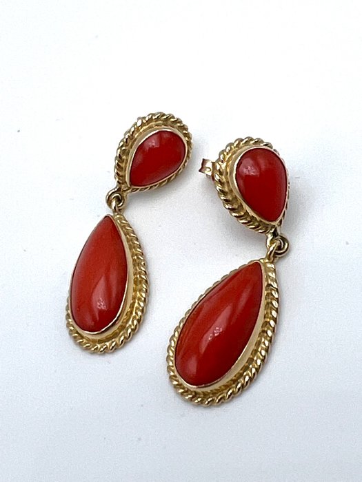 klassieke oorbel uit de jaren 70 in mediterraan koraal (coralium rubrum) volledig met de hand gezet in 18kt geelgoud
