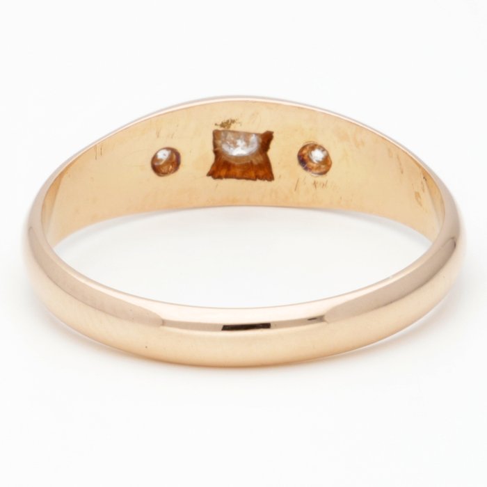18 Karaat geelgouden rij-ring bezet met 3 briljant geslepen diamanten van totaal ca. 0.075 ct., welke zijn gezet in een open pavézetting. De ring is voorzien van een tijdloos design.