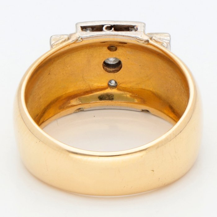 18 karaat bi-color gouden ring bezet met 1 briljant geslepen diamant en 12 single cut diamanten van totaal ca. 0.21 ct. De 3 middelste diamanten zijn gezet in een open zetting en de omringende diamanten zijn gezet in een dichte pavé zetting. De ring is vervaardigd uit geelgoud met een deels uit witgoud vervaardigd middenstuk.
