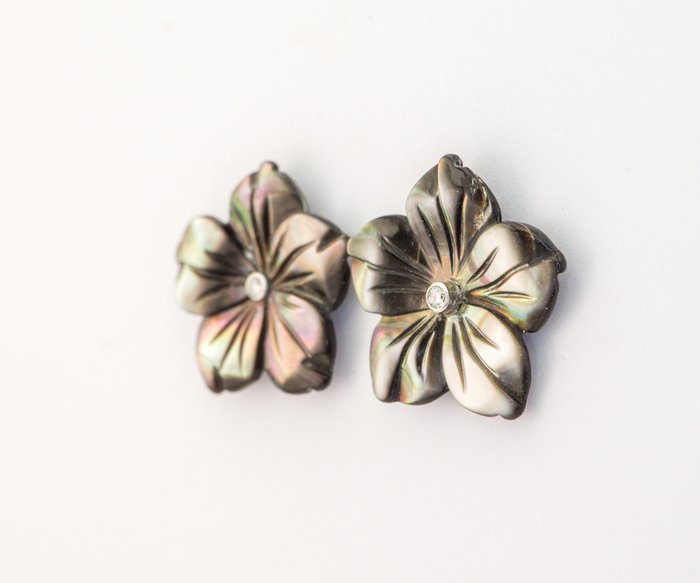 Elke oorbel bestaat uit een witgouden middenstuk met een diamant in het midden. Een ander stuk grijs parelmoer in de vorm van een uitgesneden bloem omringt het. Het totale gewicht van het parelmoer is 8 karaat.