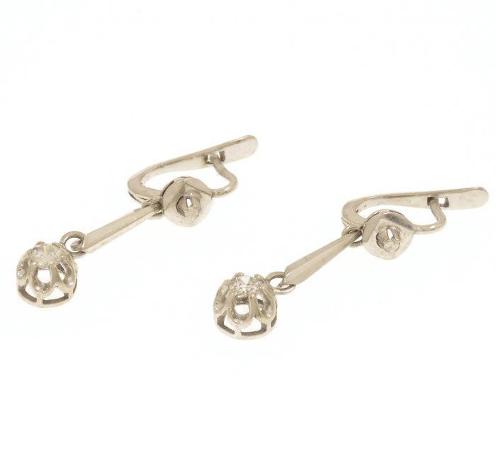 Vintage levelback oorbellen in 18k witgoud met briljant geslepen diamanten. Elke oorbel bestaat uit een ruit met 1 kleine diamant, een scharnierstaafje en een eindzetting met 1 diamant. Handgemaakt, de oorbellen hebben een goudkeurmerk van 750. Verzonden via UPS met verzekering. Het garantiecertificaat is afgegeven door Botta Gioielli.