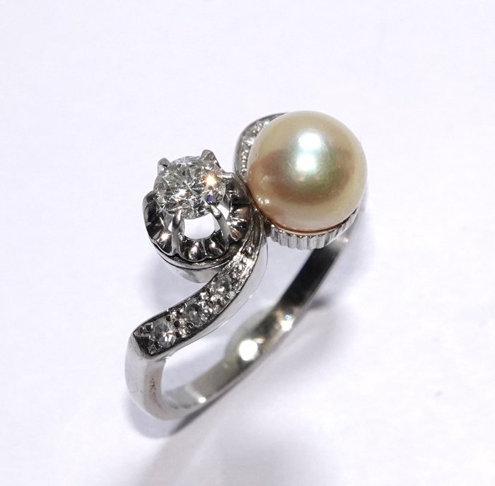 Vintage ring van 750/18 kt witgoud. De uiteinden van de ringband zijn iets verschoven, waardoor er een dialoog ontstaat tussen de oud geslepen solitaire en de parel. De uiteinden van de ringband zijn extra geaccentueerd met ingelegde diamanten (2 x 3 stuks). Vintage ring in uitstekende staat.
