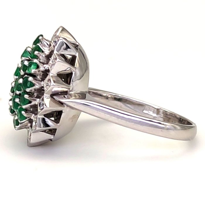 Ring van 18 karaat witgoud met 25 smaragden van in totaal 1,00 ct en 14 diamanten van in totaal 0,14 ct