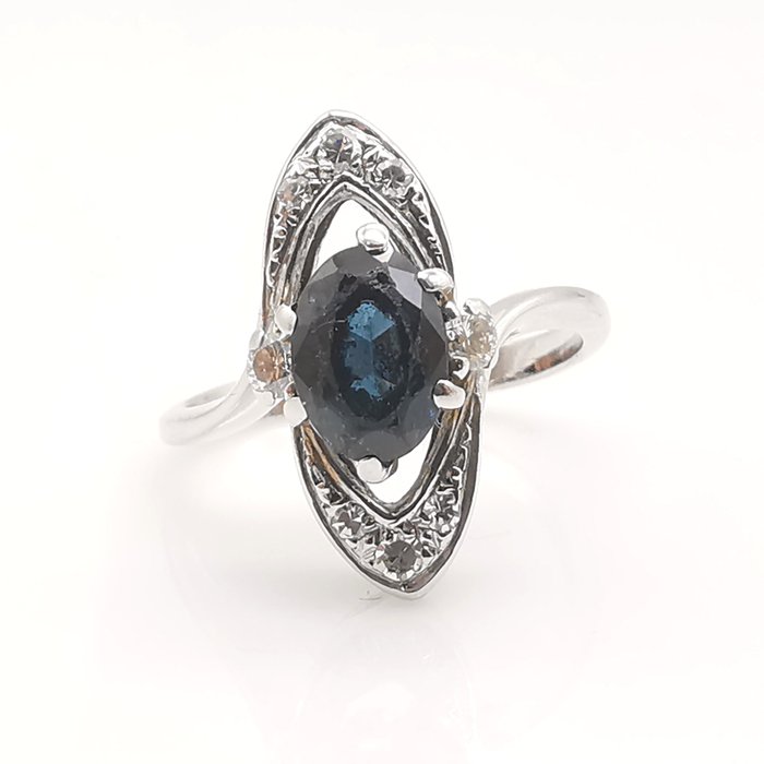 oude ring in 18K witgoud bezet met een ovaal geslepen saffier van circa 1.05 ct en bezet met 4 briljant geslepen diamanten van circa 0.16 ct G VS