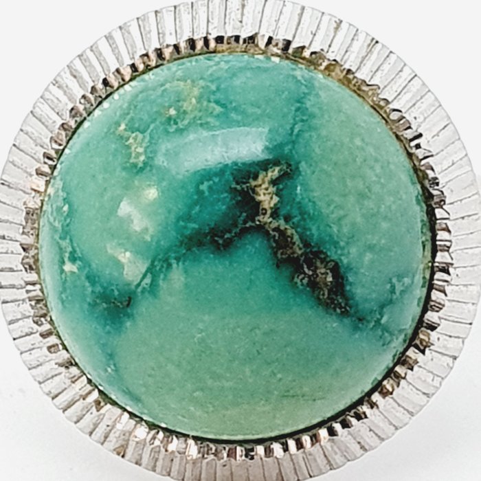 18k witgouden ring met 16mm cabochon geslepen turkoois, aangepast aan een opengewerkte kap met geometrische motieven en met een gegroefd frame.