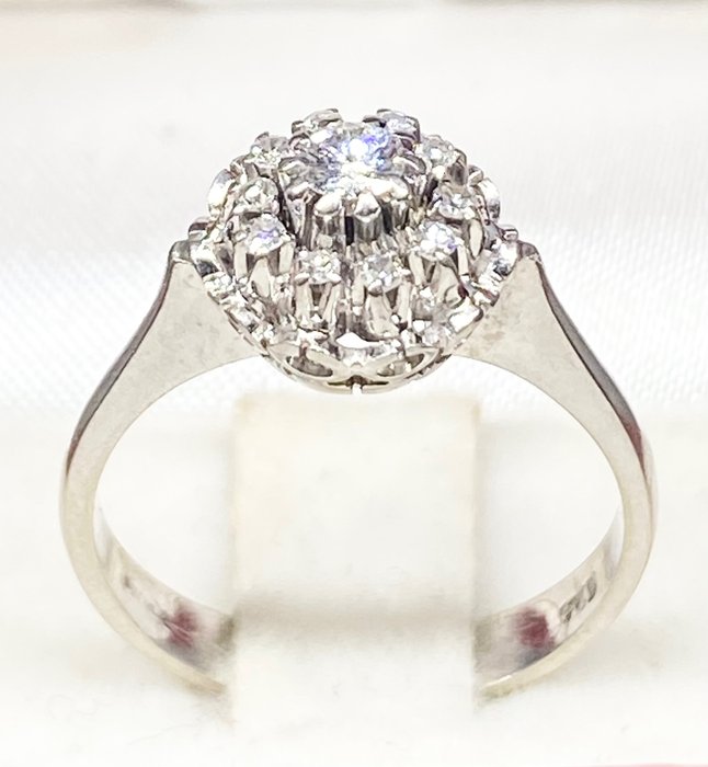 Elegante ring van 18 kt goud en diamanten De ring is gemaakt van 18 kt witgoud en bevat een centrale diamant omringd door tien diamanten. De diamanten zijn allemaal briljant geslepen, kleur G, zuiverheid VVS1: de middelste heeft een karaatgewicht van 0,20 ct, terwijl de anderen er omheen een karaatgewicht hebben van 0,01 ct elk voor een totaal van 0,10 ct; het totale karaatgewicht van de centrale diamant en die eromheen is dus 0,30 ct.