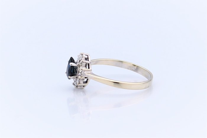 Cocktailring gemaakt van 18 kt. Witgoud met een gefacetteerde druppelvormige saffier van 0,50 ct. omrand in wit goud met 11 diamanten.