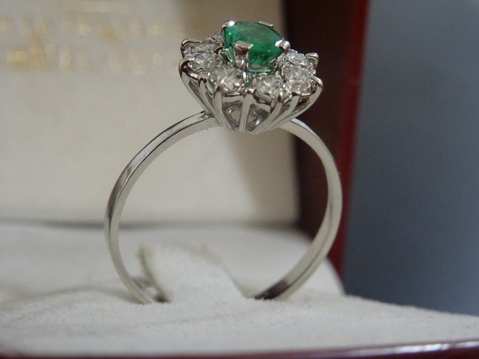 De tafel is bekrast met een prachtige smaragd van een prachtige groene kleur. Acht zeer lichtgevende diamanten verfraaien harmonieus de smaragd en accentueren prachtig de tafel.