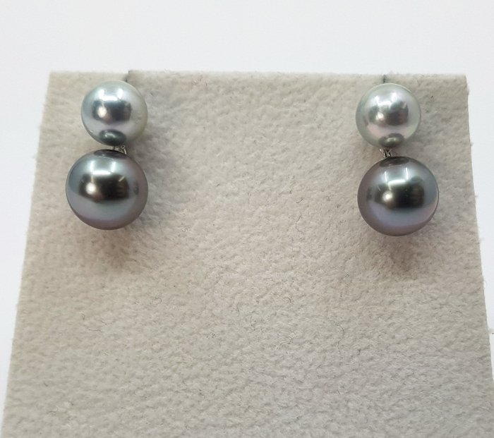 De witte Akoya-parel heeft een diameter van 7,5 mm en zit op de oorlel, terwijl de groene Tahitiaanse parel 8,5 mm meet en onder de oorlel bungelt.