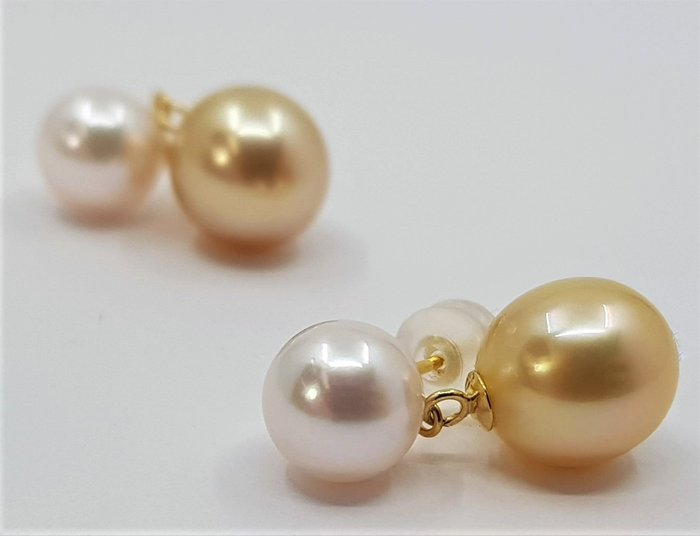 De witte Akoya-parel heeft een diameter van 7,5 mm en zit op de oorlel, terwijl de gouden Zuidzeeparel 9,5 mm meet en onder de oorlel bungelt.