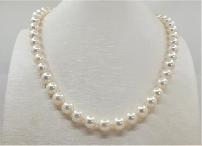 Een prachtig parelcollier van witte zoutwater AAA Akoya parels met uitzonderlijke glans, afgewerkt met een elegante zilveren bolsluiting.
