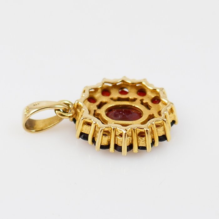 Een geelgouden hanger bezet met fonkelende granaten in een entouragezetting. De middelste steen is 5 x 7 mm, ca. 0.70ct, de omringende stenen zijn 2,5mm, 010ct per stuk. Het totaal gewicht van de granaten is ca. 1.90ct. Bij deze hanger is ook een set oorbellen te koop, elders in de veiling.