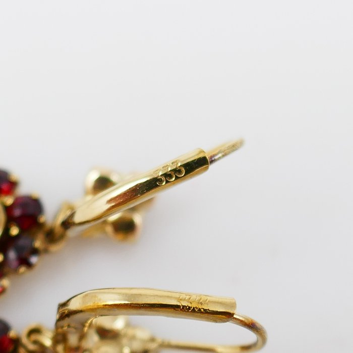 Een paar geelgouden oorbellen bezet met fonkelende granaten in een entouragezetting. De middelste steen is 5 x 7 mm, ca. 0.70ct, de omringende stenen zijn 2 mm, ca 0.06ct per stuk. In het ruitje erboven zijn de granaten ca. 0.05ct per stuk. Het totaal gewicht van de granaten is ca. 3.0ct. Bij deze oorbellen is ook bijpassende hanger te koop, elders in de veiling.