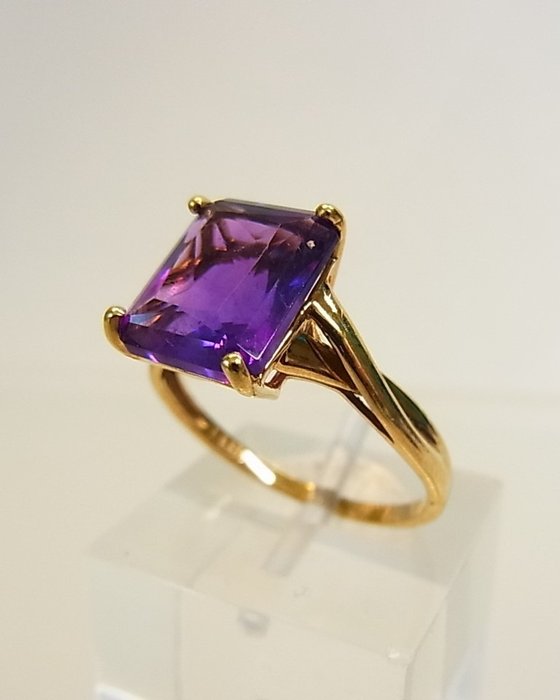 De ringkop is bezet met een achthoekige gefacetteerde natuurlijke amethist die wordt vastgehouden door tanden in de hoeken.