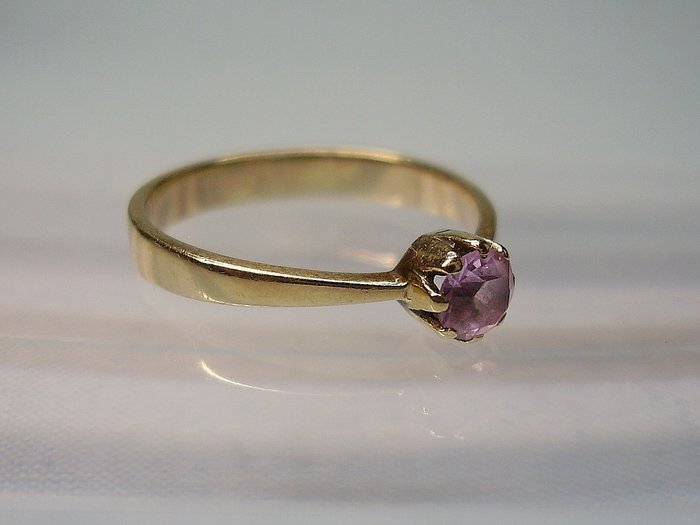 De ringkop is bewerkt als een kroon en draagt een ronde gefacetteerde lilakleurige amethist in oud slijpsel, die wordt vastgehouden door een krans van tanden.