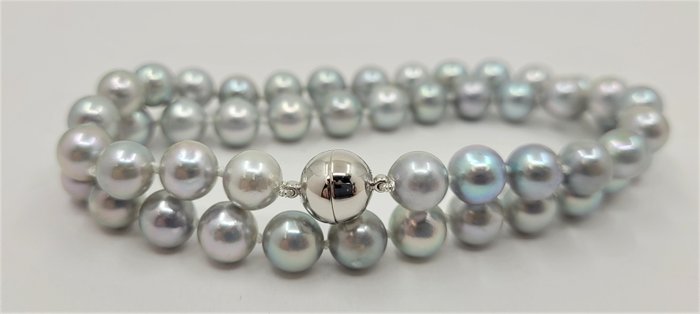Een prachtig parelcollier van zilverachtige zoutwater AAA Akoya parels met uitzonderlijke glans, afgewerkt met een magnetische bolsluiting in massief zilver.