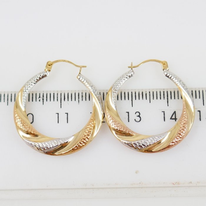 Een paar leuke tricolore creolen met een twist. De kleuren wit en rosé goud zijn bewerkt met een patroontje, het geelgoud is glad.