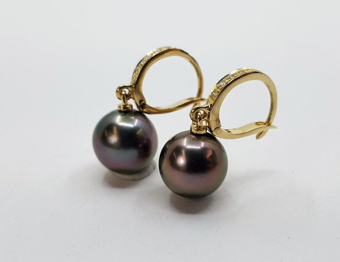 9x10mm Peacock Tahitian Pearl Drops - 14 karaat Geel goud - Oorbellen - 0.09 ct