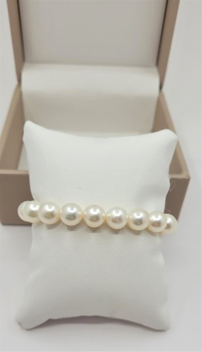 Een prachtige parelarmband van witte zoutwater Akoya parels met een uitzonderlijke glans.