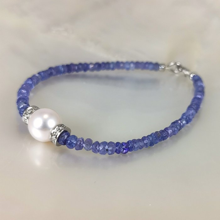 Uitzonderlijke en prachtige armband in witgoud 18K met een prachtige Japanse Akoya gekweekte parel perfecte ronde vorm TOP GEM Kwaliteit Ø 10 MM natuurlijke wit roze tinten kleur. Met edelstenen Tanzanites rondels gefacetteerd van Ø 3 tot 4,6 mm en 18 rond geslepen diamanten Totaal 0,18cts F/VS.