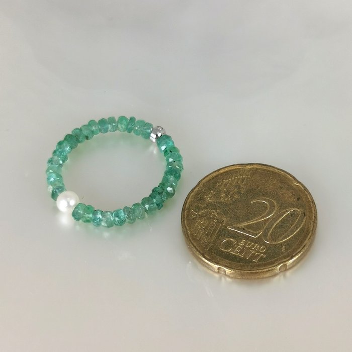 Prachtige ring met smaragden met een mooie Japanse Akoya gekweekte parel perfect ronde vorm Ø 3,5x4 MM natuurlijke witte kleur. Edelstenen Smaragden rondels gefacetteerd Ø 3x4 mm geregen op staaldraad. Vingermaat 54 (14).