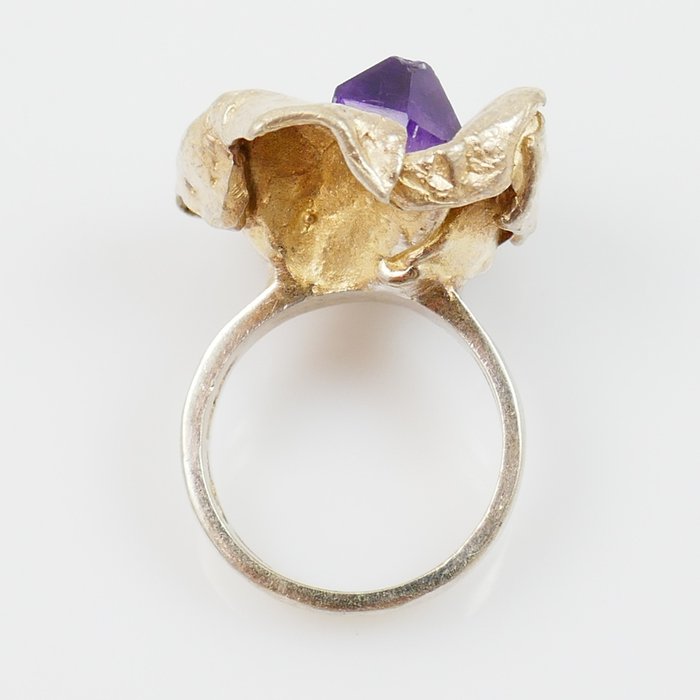 Een prachtige handgesmede ring met voorop een bloem met een hart van amethist. De amethist is een natuurlijke kwarts punt. De band van de ring is zeer stevig. De ring is voluit gesigneerd maar ik kan helaas de maker niet identificeren, het meesterteken is te onduidelijk.