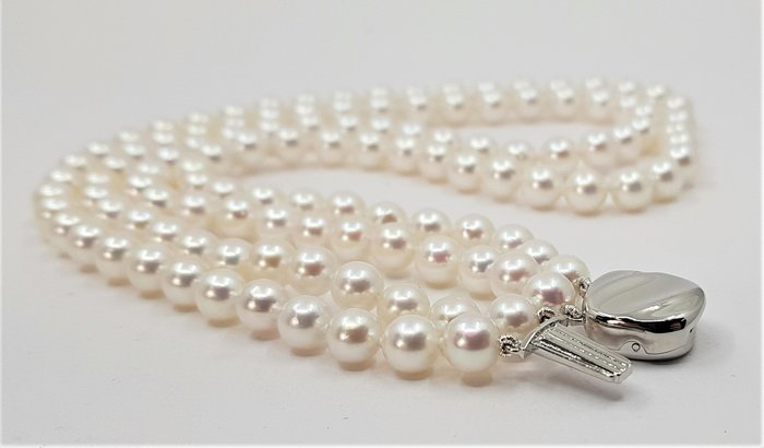 Een prachtig collier met dubbele parels van witte zoutwater Akoya parels met uitzonderlijke glans, afgewerkt met een elegante sluiting in massief zilver.