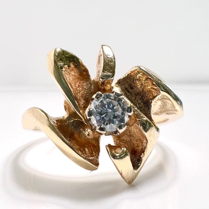 Ring van 585/14 kt geelgoud. Het creatieve ontwerp getuigt van de goudsmidkunst van een Finse meester. De ring is gemarkeerd met een symboolkeurmerk en het woord "FINLAND". Moeilijk af te lezen door een ringwisseling. In het midden zit een briljant geslepen diamant van 0.10 ct. met de kleur F en de zuiverheid VS.