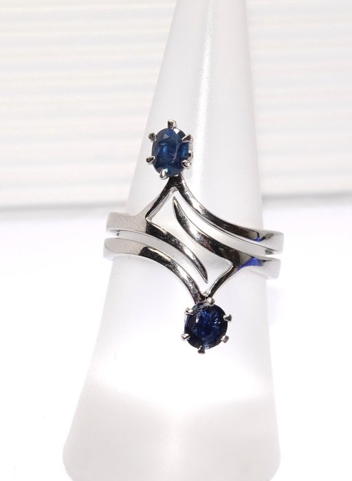 Elegante vintage saffierring in gepolijst 585/14K witgoud. De gebogen en verschoven uiteinden van de dubbele ringband vormen twee uitstekende zettingen voor elk een ovaal van 0,50 ct. saffier af. Bijna oogheldere saffieren van korenbloemblauwe kleur. Uitstekende staat. Gratis te wijzigen!