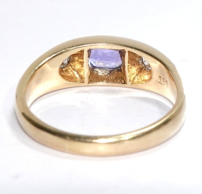 Vintage ring van 750/18K geelgoud. In de ringkop zit een tanzaniet van 0,45 ct. in ovaal geslepen en aan elke kant een diamant 0.06 ct. vlak in de ringband geplaatst. Zeer goede staat.