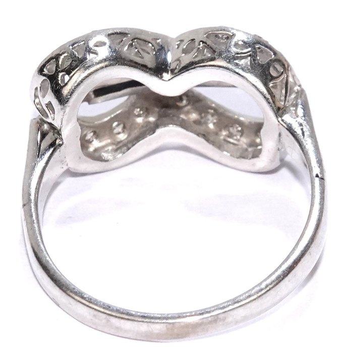 Vintage lusring in 585/14K witgoud. De ringkop is ontworpen als een dwarse eeuwigheidslus met 22 diamanten in de banden. Een licht diagonaal geplaatste witgouden sluiting houdt 7 vierkante saffierkussens vast. Uitstekende staat.