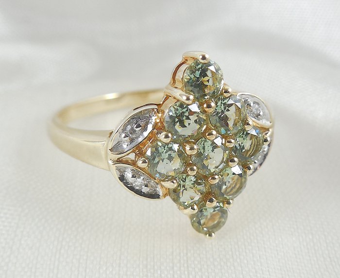 Geelgouden ring bezet met demantoïde granaat en diamanten