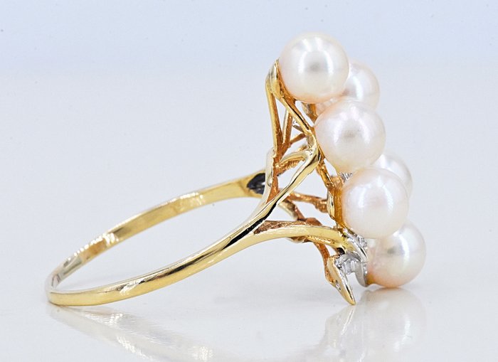 14 kt geel- en witgouden designring met diamanten en parels. Deze stenen zijn prong/channel gezet in een elegant ontworpen ring. Robuuste montage.