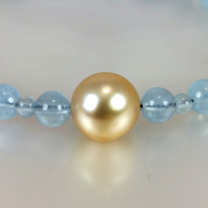 Prachtige armband in witgoud 18K met een prachtige Australische Southsea gekweekte parel perfecte ronde vorm TOP GEM Kwaliteit Ø 10x11 MM natuurlijke diepe gouden kleur. Met halfedelstenen rond van Ø 3,25 tot 5,5 mm