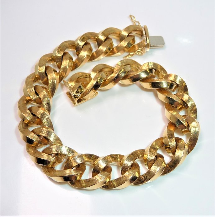 Elegante armband in 750 / 18 kt geelgoud. Een echte klassieker is deze kinband, origineel uit ca. 1960-70. De schakels passen soepel in elkaar en bieden een hoog comfort. De armband is een goudsmid werk met de hand. Het vierkante profiel is uitzonderlijk. De oppervlakken zijn aan beide zijden met de hand gegraveerd met een lijngravure, terwijl de zijprofielen glanzend gepolijst zijn. Dit resulteert in een zijdezachte, glinsterende look met glanzende effecten bij elke beweging.
