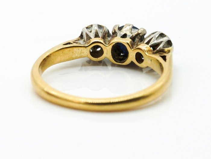 Klauw bezet met de cirkelvormig geslepen saffier tussen twee cirkelvormig geslepen diamanten, gedetailleerd 18 CT, ringmaat F, brutogewicht 2,1 g