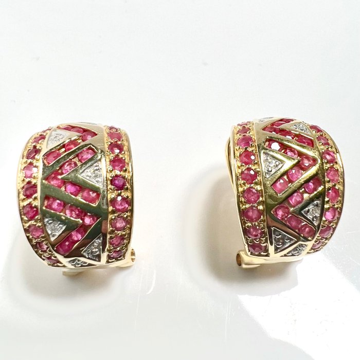 Oorbellen in 585/14 kt geelgoud met witgoud in het gebied van de diamanten. De oorbellen zijn gemaakt als brede halve oorringen en zijn naar voren gebogen. Ze hebben elk een patroon van 35 robijnen van in totaal 2,10 karaat. scherp. De middelste robijnen zijn strak gezet in een vrije kanaalzetting. De Räner zijn pavé bezet met robijnen. Tussen de middelste robijnen bevinden zich 5 achthoekig geslepen diamanten van in totaal 0,10 ct. (G/SI). De oorbellen hebben een stud en een omega clip. Ze zitten heel goed en dicht bij het oor.