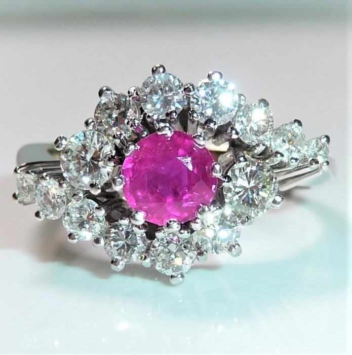 Gala-ring in 585 / 14 kt witgoud. Met de hand gemaakt - handgemaakt. Een robijn van 6 mm in doorsnee en ca. 1.00 ct. licht op in het midden. Het is omlijst door in totaal 14 briljant geslepen diamanten van in totaal 1,22 ct. Deze waarde staat ook aan de binnenkant van de ringband gegraveerd. De diamanten zijn gerangschikt in volgorde van grootte. De grootste diamanten zijn ca. 2 x 0,20 ct.