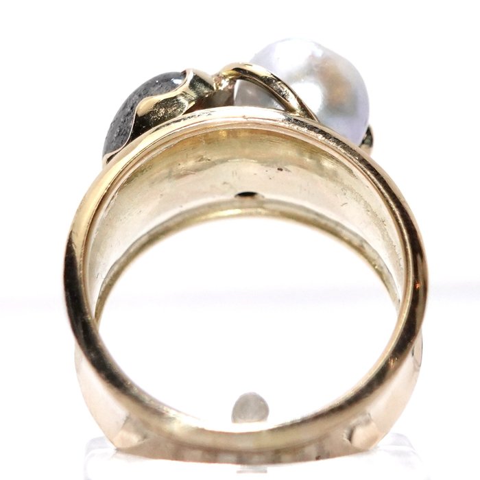 Handgemaakte bandring in 585/14K geelgoud. In de ringkop zit een ensemble van labradoriet (blauwachtig, doorschijnend), parel en een 0.30 ct. diamanten gezet. Stevig handwerk 8,8 gram; Enkel item in uitstekende staat.