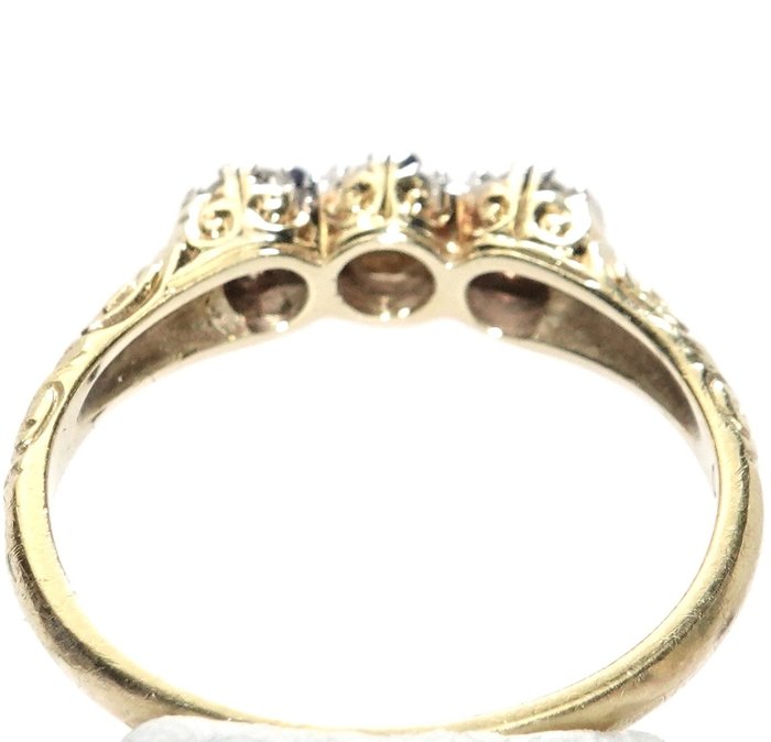 Handgemaakte vintage rijring in 585/14K in 585/14K geelgoud. In de ringkop 3 diamanten van elk 0,11 ct. (gekeurd) in versierde mandbevestigingen. De kop en ringschouders zijn versierd met ranken. Beste staat.