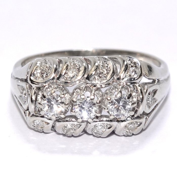 Vintage ring in 585/14K witgoud. De ringkop is gerangschikt in drie rijen. De middelste rij is gezet met 3 stenen van elk 0,15 ct. gezet, de buitenste rijen elk met 4 stenen van elk 0,03 ct. Zeer goede staat.