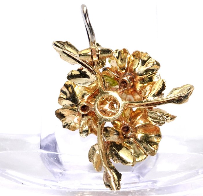 Handgemaakte bloemenhanger in 750/18K geel goud. De bladeren van de drie bloemen zijn met de hand beschilderd in oranje, groen en crèmewit en elk heeft een diamant in witgouden tanden in het midden. Witgouden oogje met een binnendiameter van 3,8 mm om als zweefvliegtuig te dragen. Fijnste filigrane handwerk in zeer goede staat.