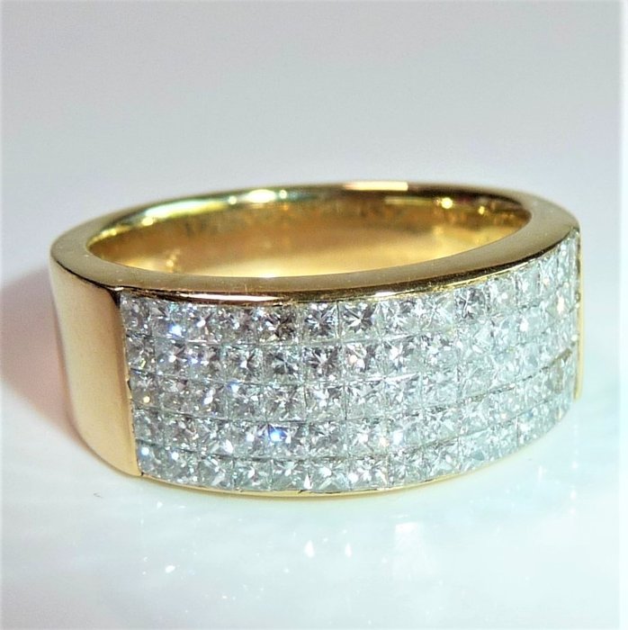 Ring van massief 750/18 kt geelgoud. De platte bandring heeft in totaal 75 diamanten in de edele prinsessenslijping. De diamanten zijn strak op elkaar gezet als een glinsterend oppervlak in "onzichtbare zettingen" in rijen van 5 x 15 diamanten van in totaal 2,25 ct. Dit komt overeen met 75 x 0,03 ct.